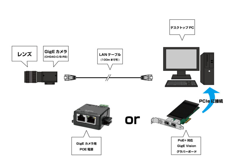 このカメラはGigEタイプなので、LANケーブルで最長100mまで延長し、構築できます。