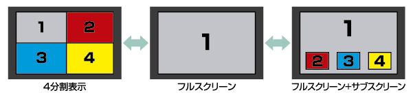 ●4分割表示、フルスクリーン表示、サブスクリーン表示切替