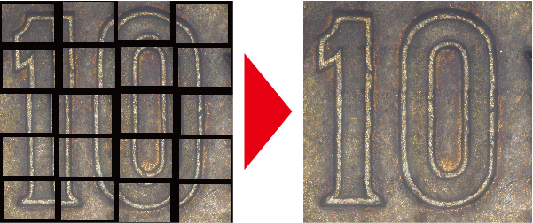 デジタルマイクロスコープの一視野の観察範囲では収まりきらない対象物に対して、画面を分割して撮影しそれらの画像を貼り合わせることで