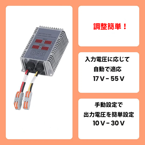 ●追加設定なしで、入力電圧17V ~55V DC までのソーラーパネル電圧に自動的に適応します。