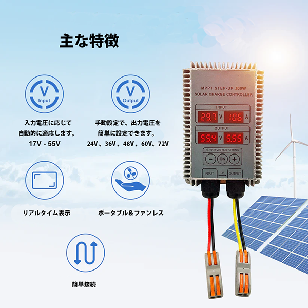 ●追加設定なしで、入力電圧17V ~55V DC までのソーラーパネル電圧に自動的に適応します。