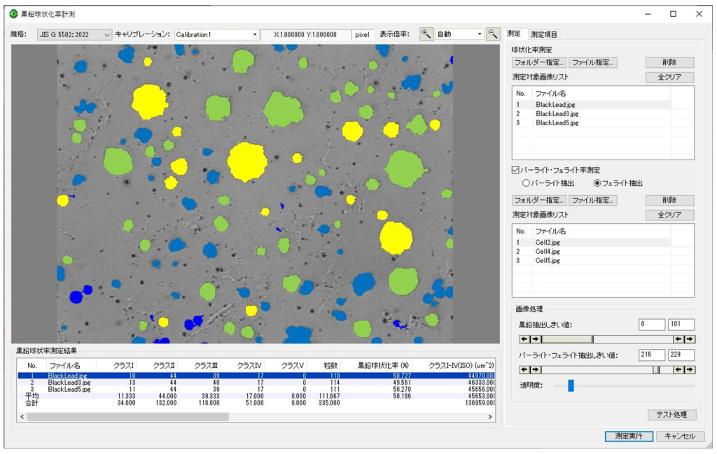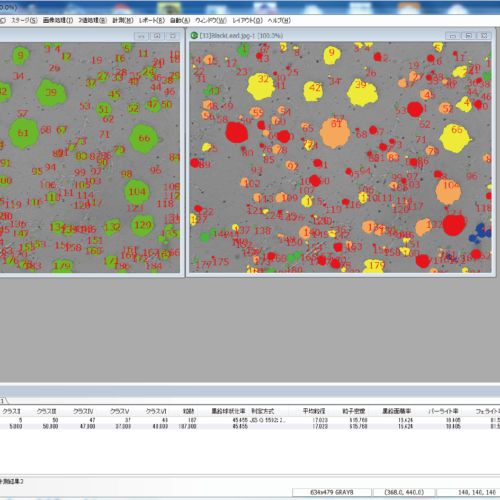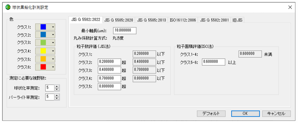 黒鉛球状化率計測を行う際に規格の設定や、クラス分けの表示色の設定が可能