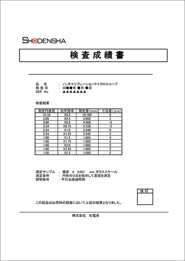 マイクロスコープには、検査証明書が付属します。