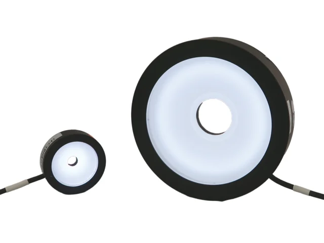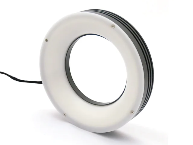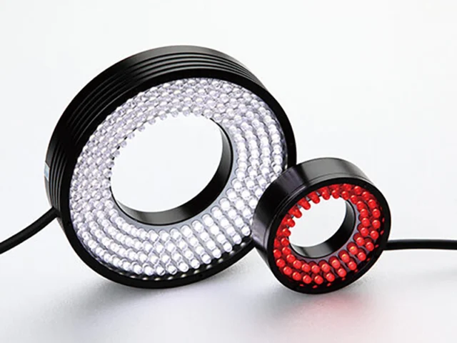 リング照明とは、レンズやカメラの周囲を囲むように配置された照明で、対象物を均一に照射できる照明装置です。影が出にくく、反射ムラを抑えた安定した照明環境を実現できるため、外観検査や寸法測定、マイクロスコープ観察に適しています。電子部品や金属部品、基板などの検査で多く使用され、観察精度と検査再現性の向上に貢献します。
