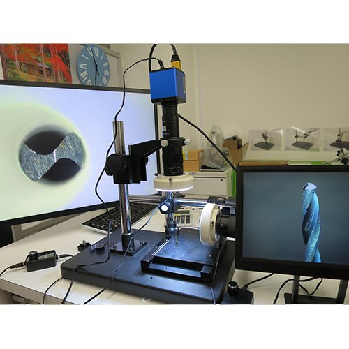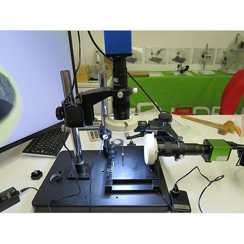 ●対象物を上、横の両方向から2画面同時観察するために1つのスタンドに2つのマイクロスコープを設置。