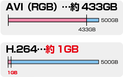※ H.264圧縮のファイルサイズは、映像の複雑さや動きの激しさ等でサイズが変動します。