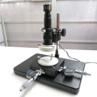 デジタルマイクロメーターのハンドルを回すことにより微動で正確に動くXYステージ