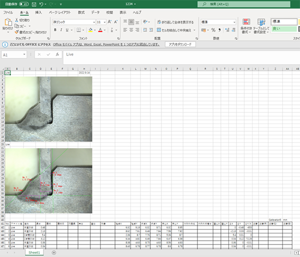 生画像、計測値入画像(ライン入画像)込みで、計測値が一発でExcel出力されるので、