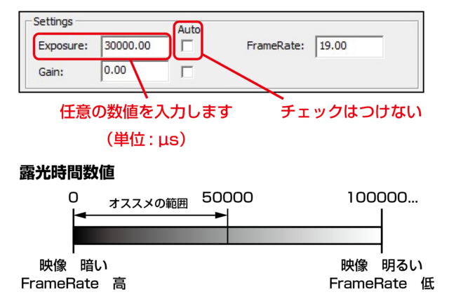 Exposureの数値に比例して映像は明るくなります。 ※数値を上げ過ぎるとFrameRateが著しく低下し カクカクとした映像になります。 |
