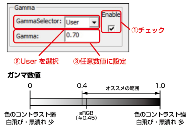 チェックをつけるとガンマ補正が有効になります。 Userを選択してガンマ数値に任意に設定します。 (1.0はガンマ補正なしの状態と同等です。) 映像の白飛び、黒潰れや色のコントラストの バランスを見ながら数値を調整してください。 |